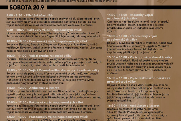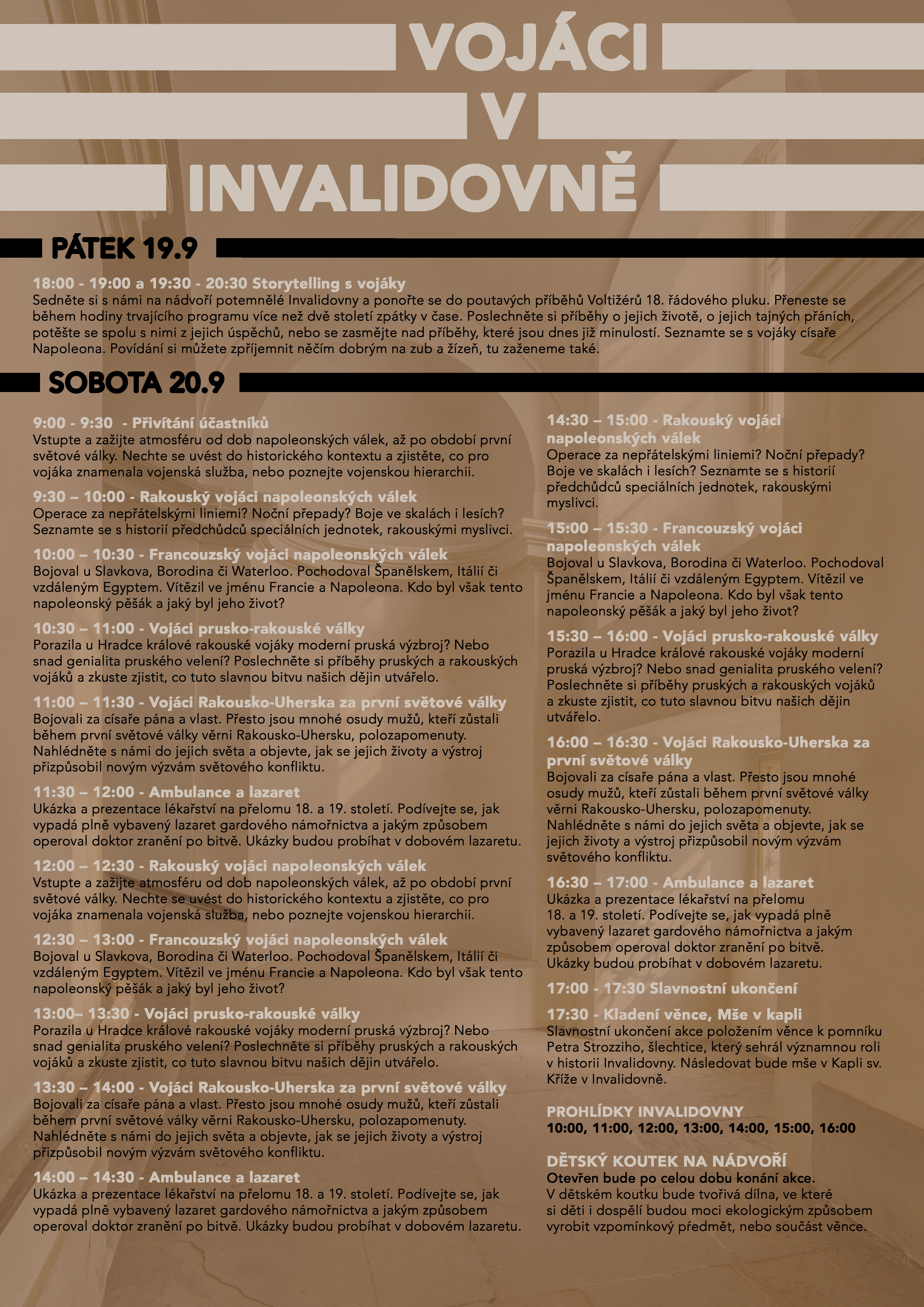 Ve dnech 19. a 20.9.2025 bude MČ Praha 8 v barokním objektu Invalidovny hostit spolky nadšenců, zabývajících se rekonstrukcí rakouských a francouzských jednotek z období napoleonských válek, prusko-rakouské války a první světové války. Nádvoří Invalidovny se tak na dva dny promění v ležení a lazaret. Těšit se můžete na představení uniforem a výzbroje, na různé živé ukázky, ale i na přednášky o vojenském životě, o jeho každodennosti či o tom, jak se vojenství měnilo v průběhu let. Na své si přijdou i děti, pro které bude připravená tvořivá dílna.