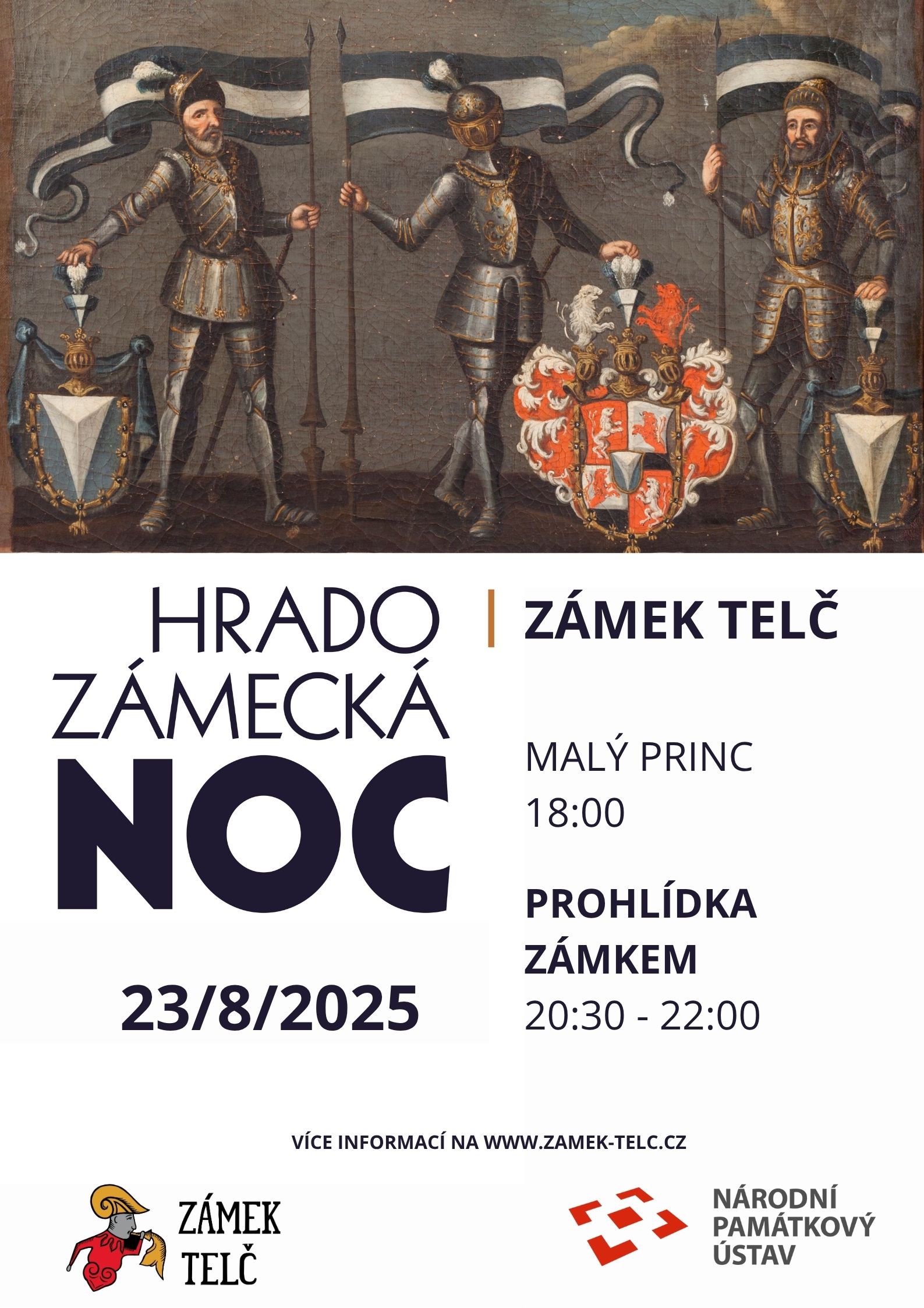 Od 20:30 se otevře vstup do zámku. Reprezentační sály budou přístupné bez průvodce. Ve Zlatém sále bude připravena malá výstava připomínající působení hraběcí rodiny Lichtenstein-Castelkorn na zámku v Telči. K dispozici bude informační leták, který bude stručnou formou informovat o nejdůležitějších osobnostech rodu a dochovaných předmětech.